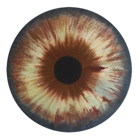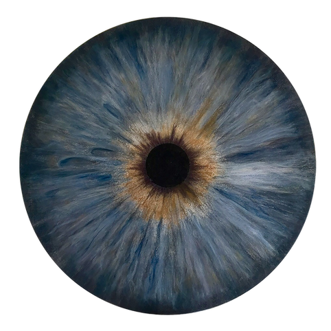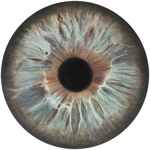 It all begins with a moment of light: a ray of sunlight passing through the iris reveals unsuspected, almost cosmic, contours in the mirror. From this revelation is born a fascination with the iris, this miniature universe where matter, light, and mystery intertwine. Through large circular pastels, some reaching a meter in diameter, I choose from the outset to enlarge the infinitely small to an extraordinary degree in order to reveal to its owner the hypnotic depth of their iris. Often, they are unaware of all its details, paying it no attention. Yet, exploring them reveals many surprises! Fascinating in its complexity beneath an apparent simplicity, each iris is a unique portrait. It is a world of captivating contours, which challenge us with their power and diversity. The iris then becomes a celestial body, an autonomous world, on the border between the human body and the cosmos. To paint an iris is also to paint a landscape: valleys, precipices, milky streams, all studded with obstacles, caverns, and enchanting craters. A celestial cartography unfolds, an inner landscape where one thinks one recognizes galaxies, volcanoes, oceans, or stellar glimmers. Mirrors of the soul, these nebulae draw us into ineffable adventures, alternating between chaotic whirlpools, tumultuous turbulence, and the deceptive calm of marshes. Strange or familiar forms seem to emerge from a fantastical nature or, conversely, from a very real world: one can lose oneself in the rippled depths of the sea or in the flames of hell, caress the plumage of a bird with one's gaze, or settle in the heart of a flower.
